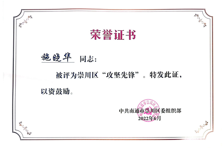 技术部副部长施晓华被崇川区委组织部授予“攻坚先锋”称号